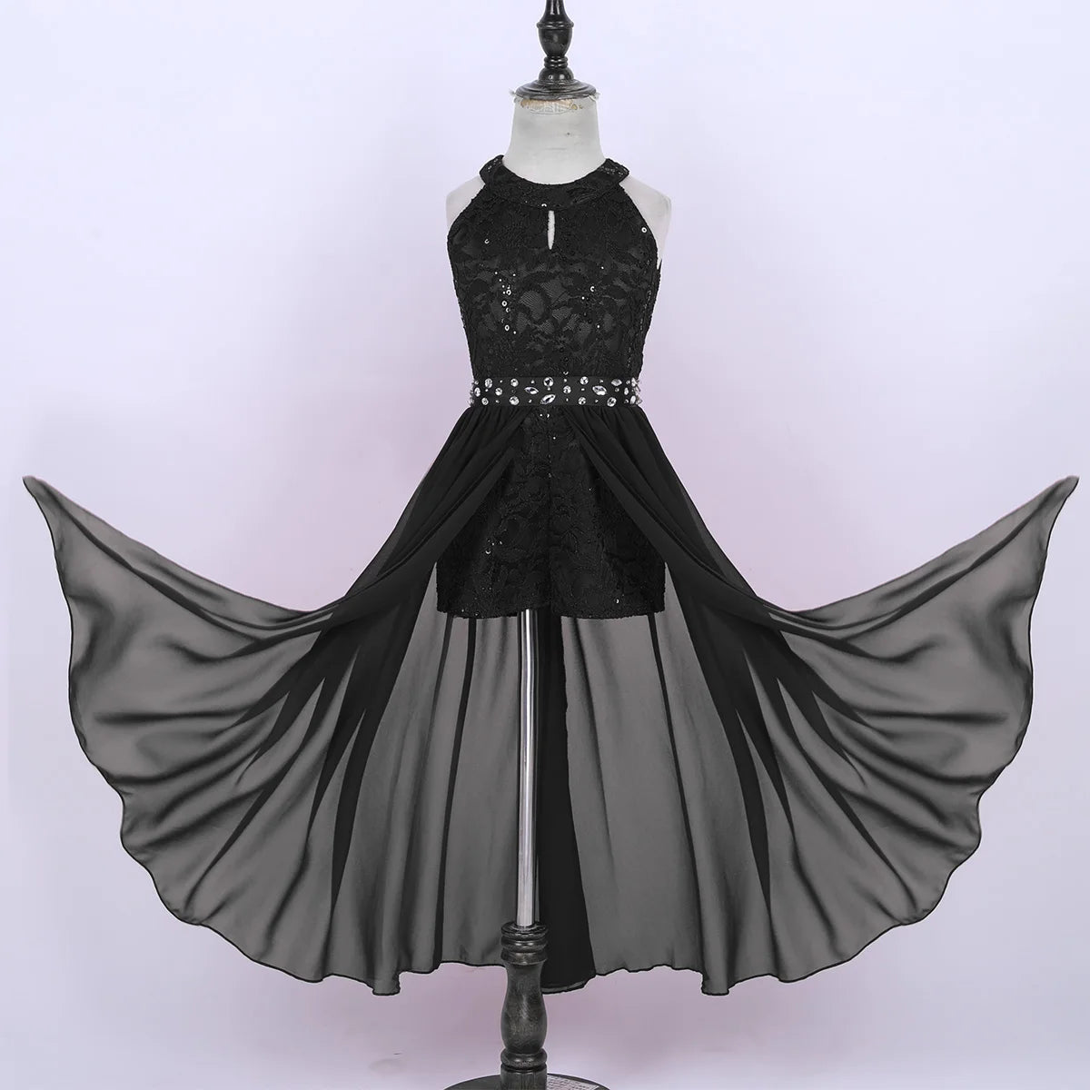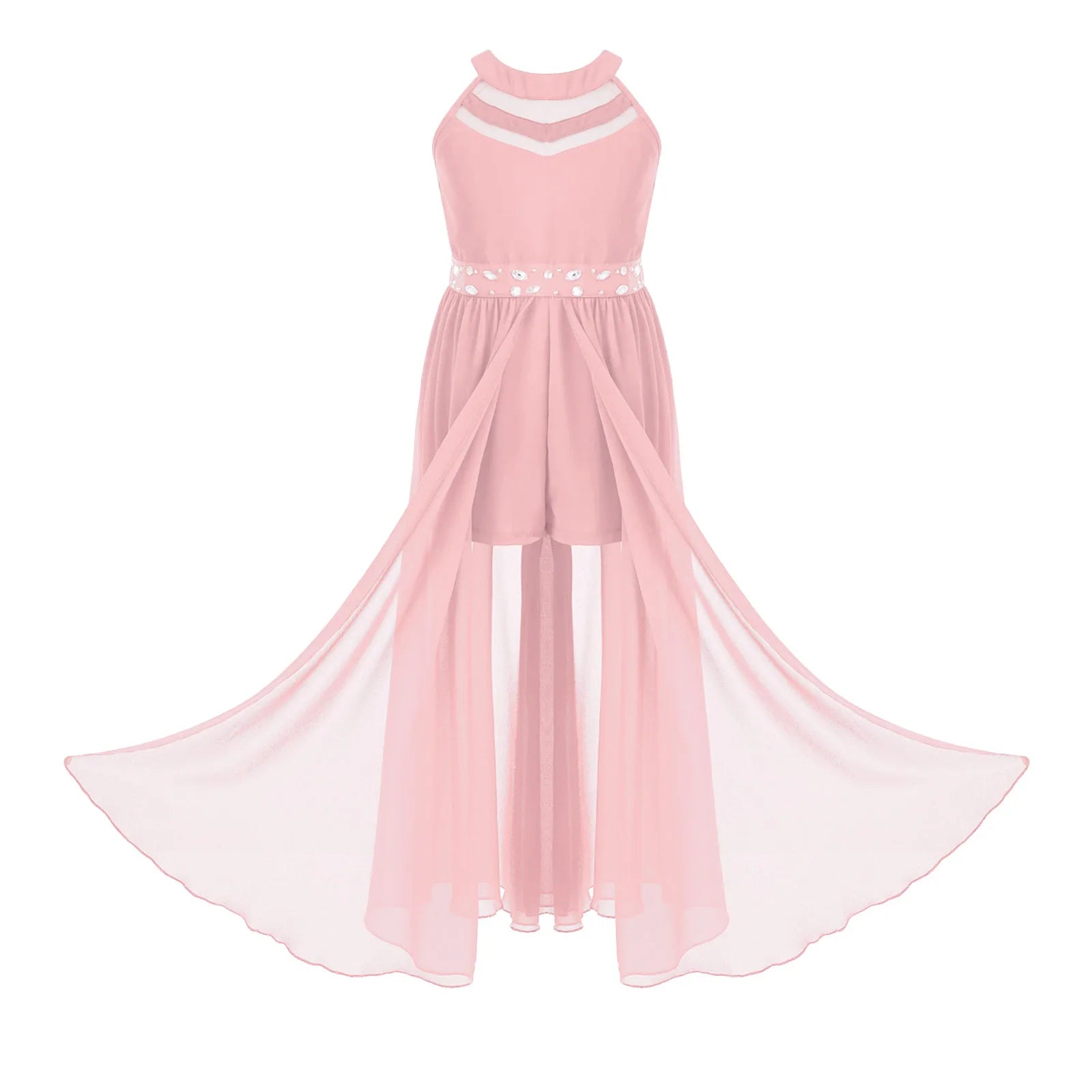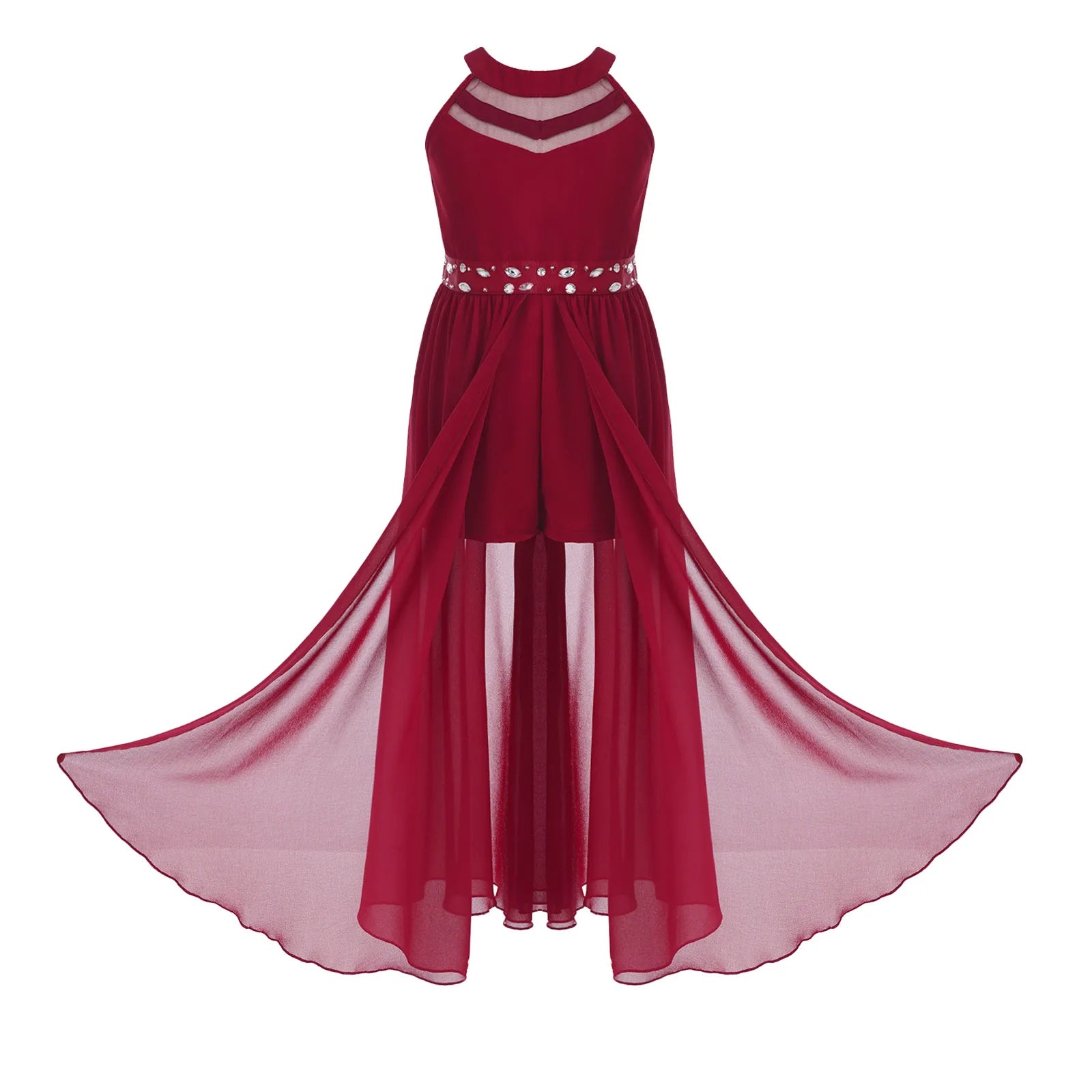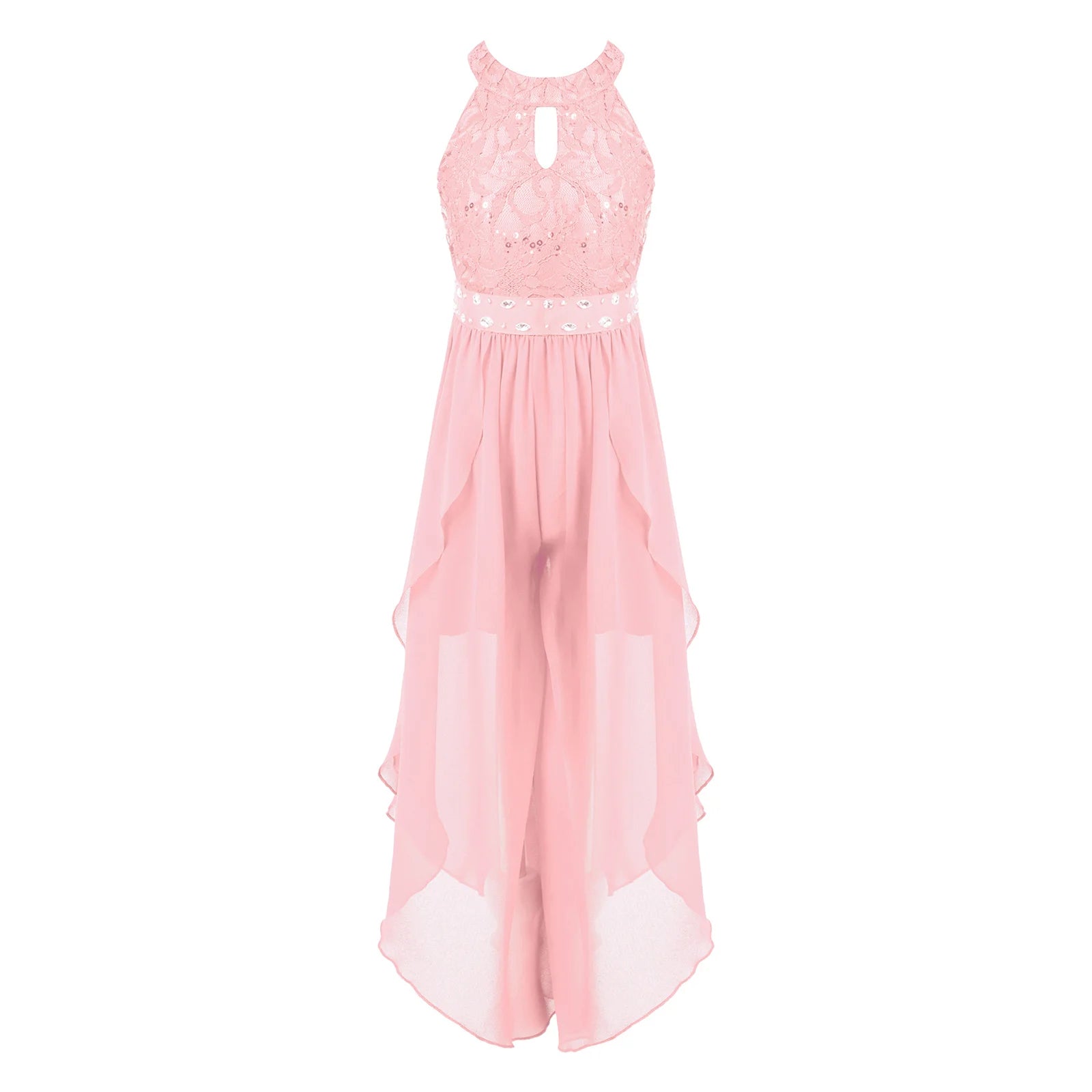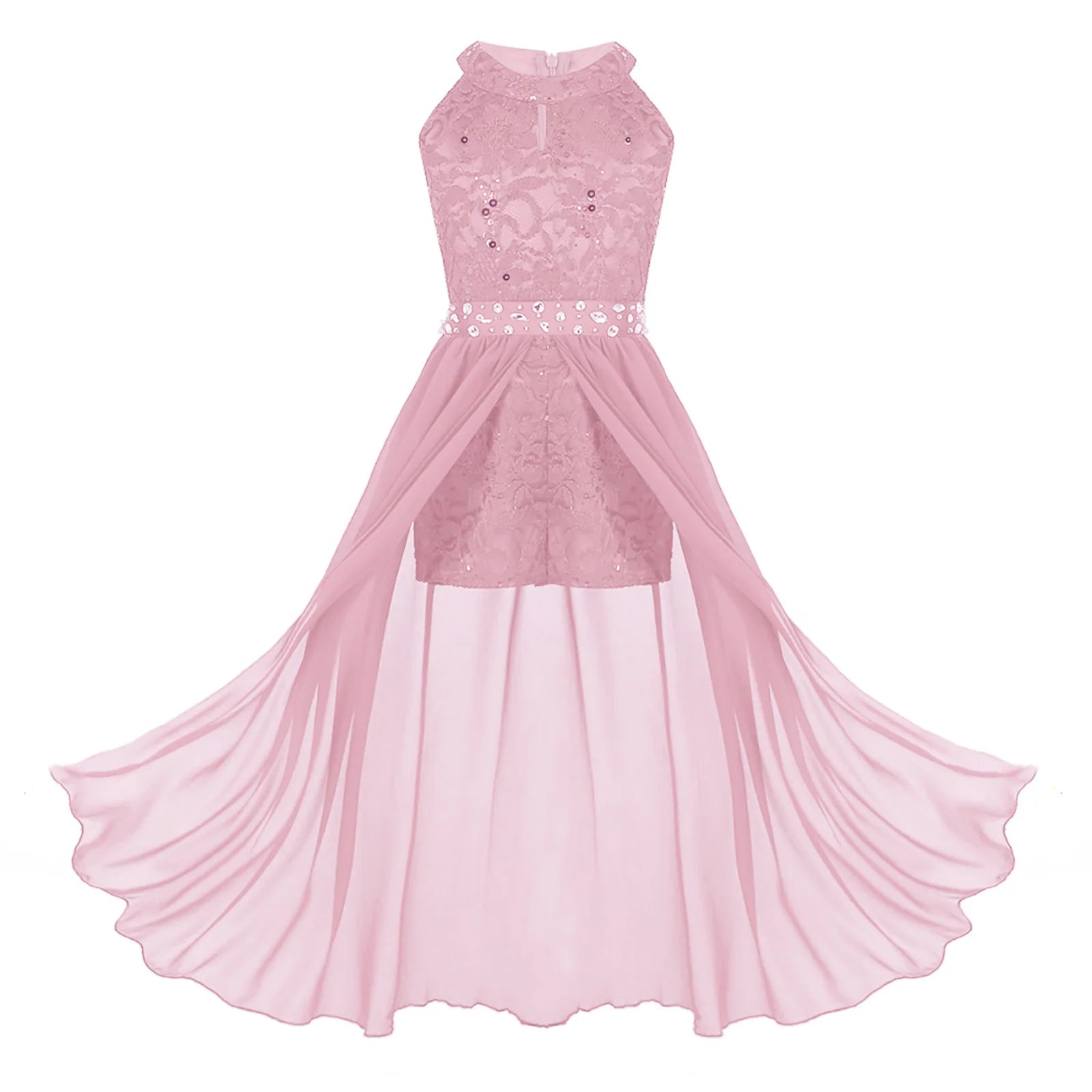 Children's Girls Maxi Romper Dress Sleeveless Floral Lace Rhinestone vestidos Kids Performance Dance Dress Girls Summer Dress