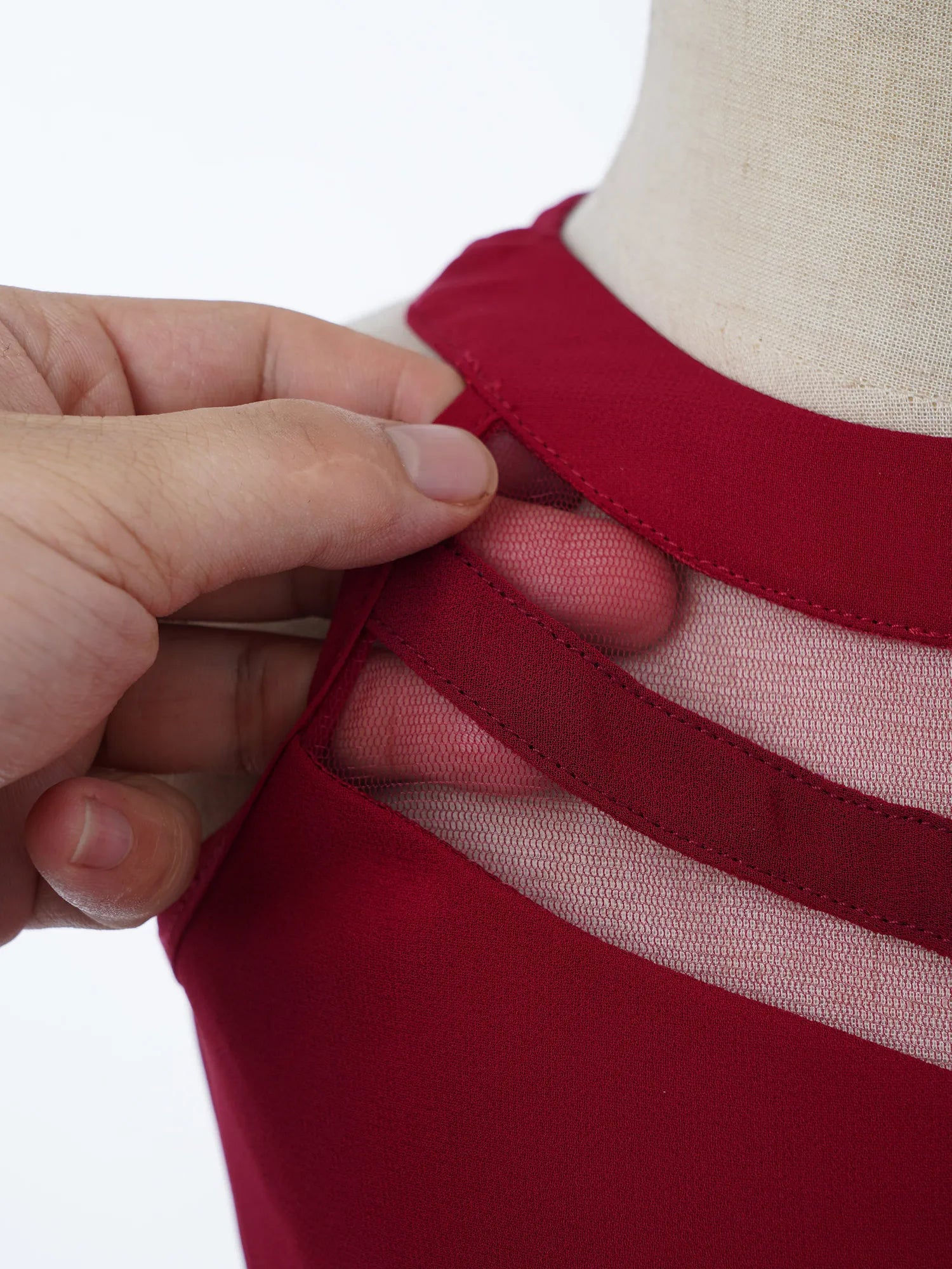 Sleeveless, round neckline, floral lace top bodice, rhinestone trim at the waist. Hidden back zipper closure.
