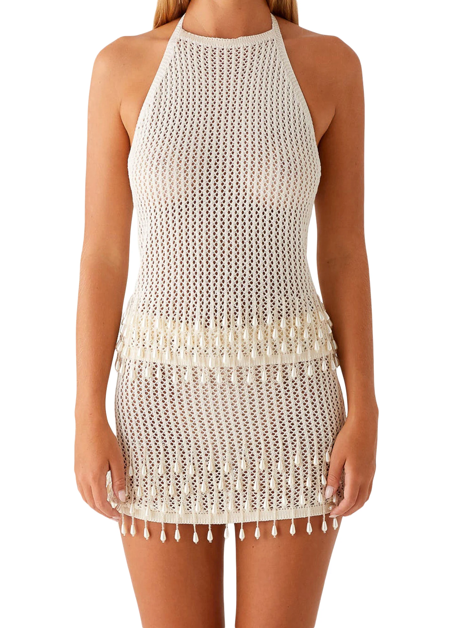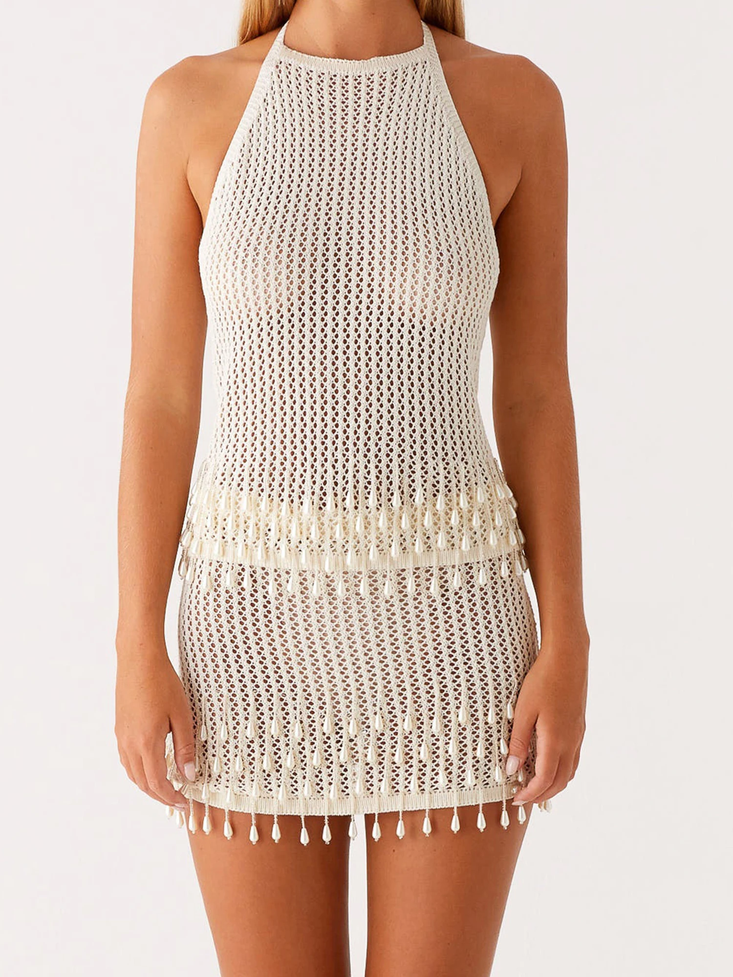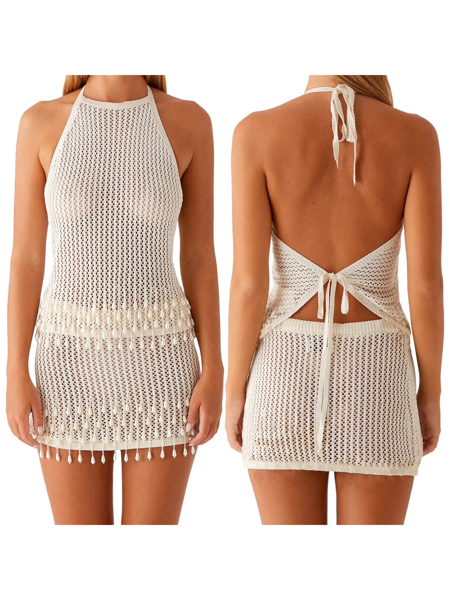 Women's Knit Skirt Set for Summer Stylish Solid Hollow Out Tie Back Backless Halter Tops with Mini Skirt 2 Pcs Set