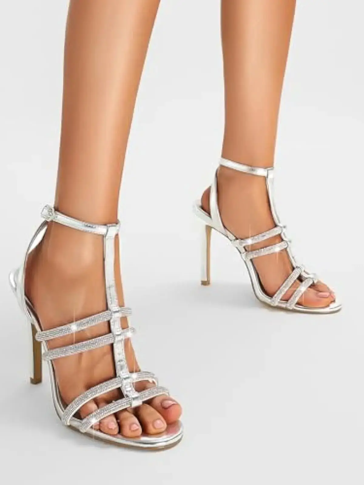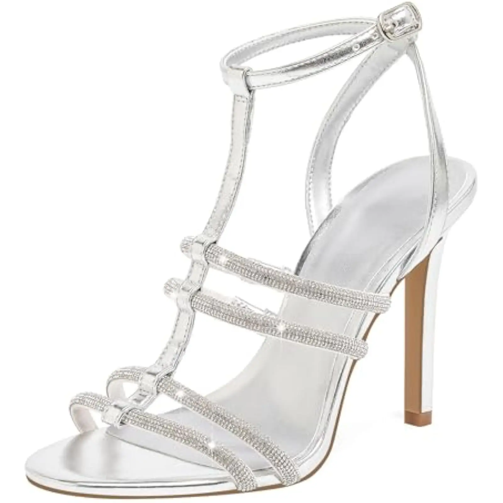 Silver Sparkly Rhinestone Sandals for Women: High Heeled with Ankle Strap, Peep Open Pointed Toe Stilettos – Comfortable Wedding