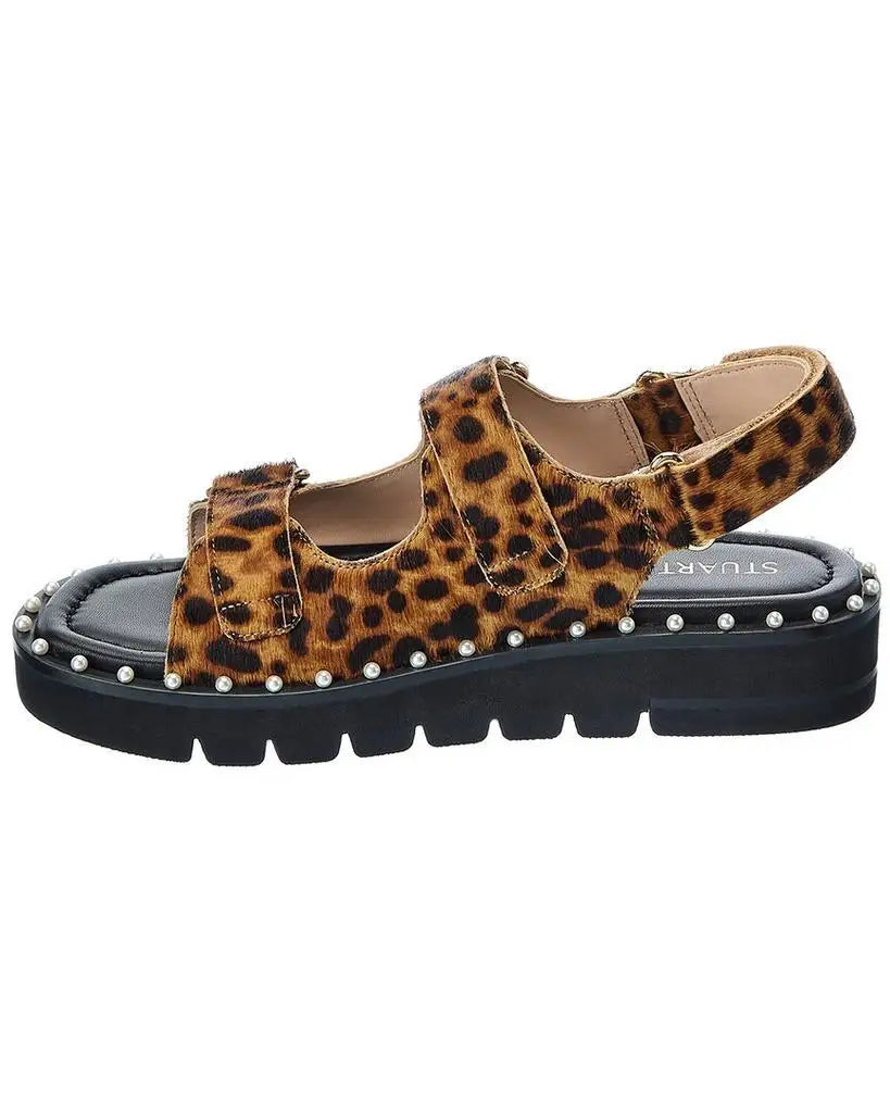 The Stuart Weitzman Zoe Lift Haircalf Sandal embodies the perfect blend of artistry and functionality, making it a must-have addition to any woman's footwear collection. Crafted with cheetah haircalf and accentuated with gold-tone hardware, this sandal exudes a luxurious and bold aesthetic. The stunning pearl embellishments add a touch of elegance to the design, elevating any outfit from casual to chic. Comfort is paramount, and the lightly padded leather insole ensures a cushioned step with every wear. The rubber sole of the Zoe Lift Haircalf Sandal offers excellent traction, providing stability and security as you navigate various surfaces. With a 1.5-inch heel, it provides a subtle lift, while the 1-inch platform adds extra height without compromising on comfort. Please note that all measurements are approximate and were taken from a size 7. Slight variations may occur. As a testament to its exceptional quality, the Stuart Weitzman Zoe Lift Haircalf Sandal is imported and reflects the brand's commitment to delivering outstanding footwear for women. Experience the perfect combination of style, comfort, and craftsmanship with this remarkable sandal from Stuart Weitzman.