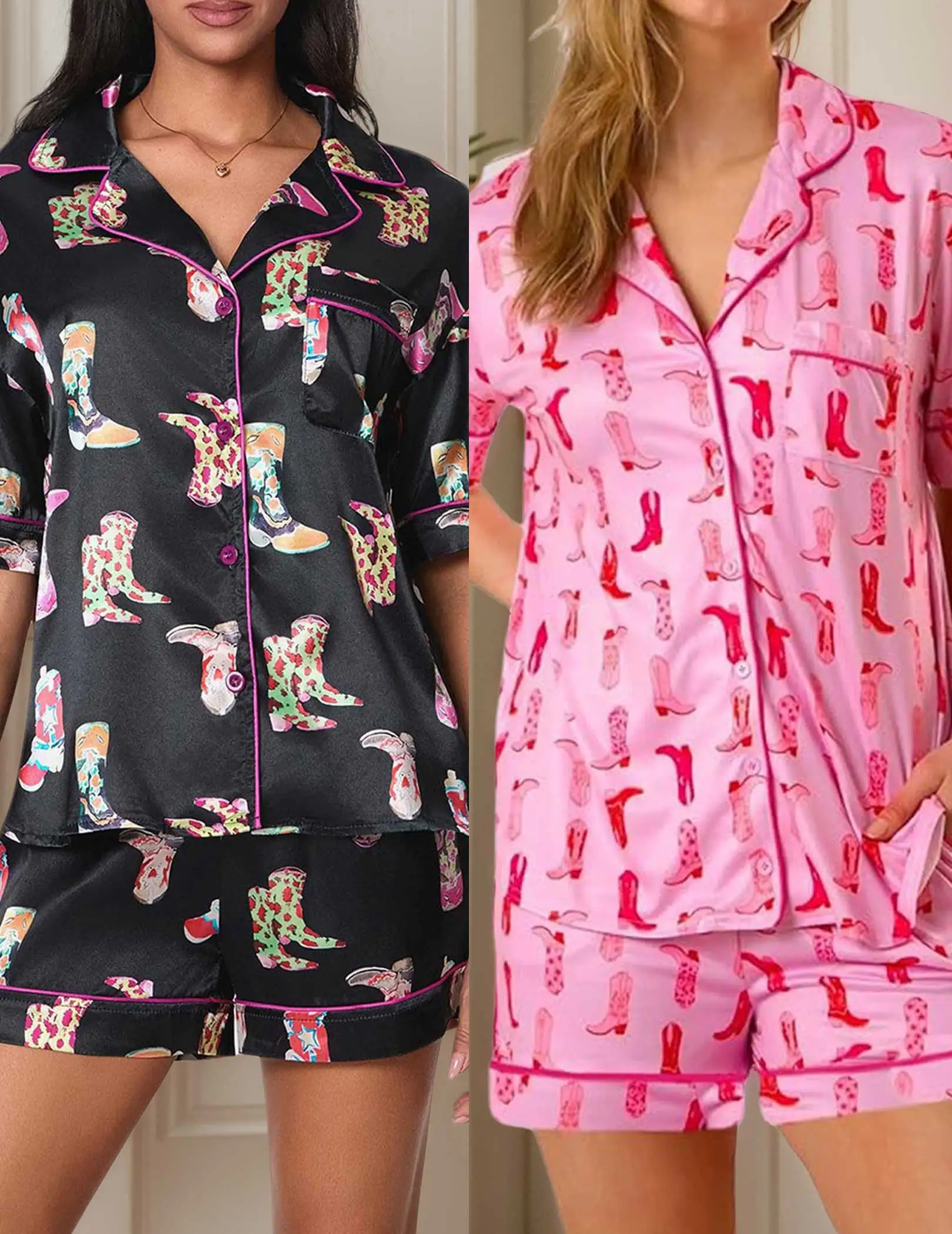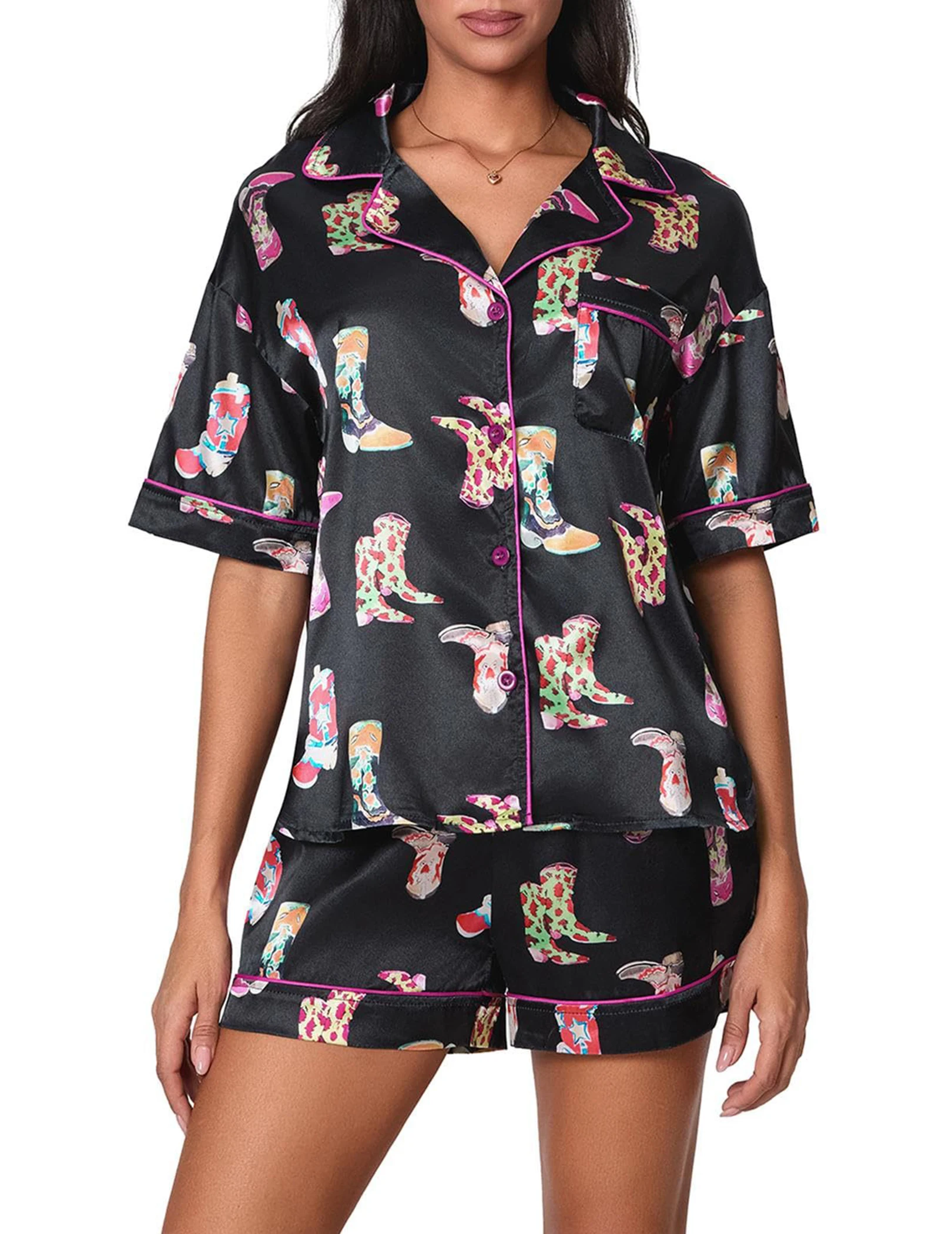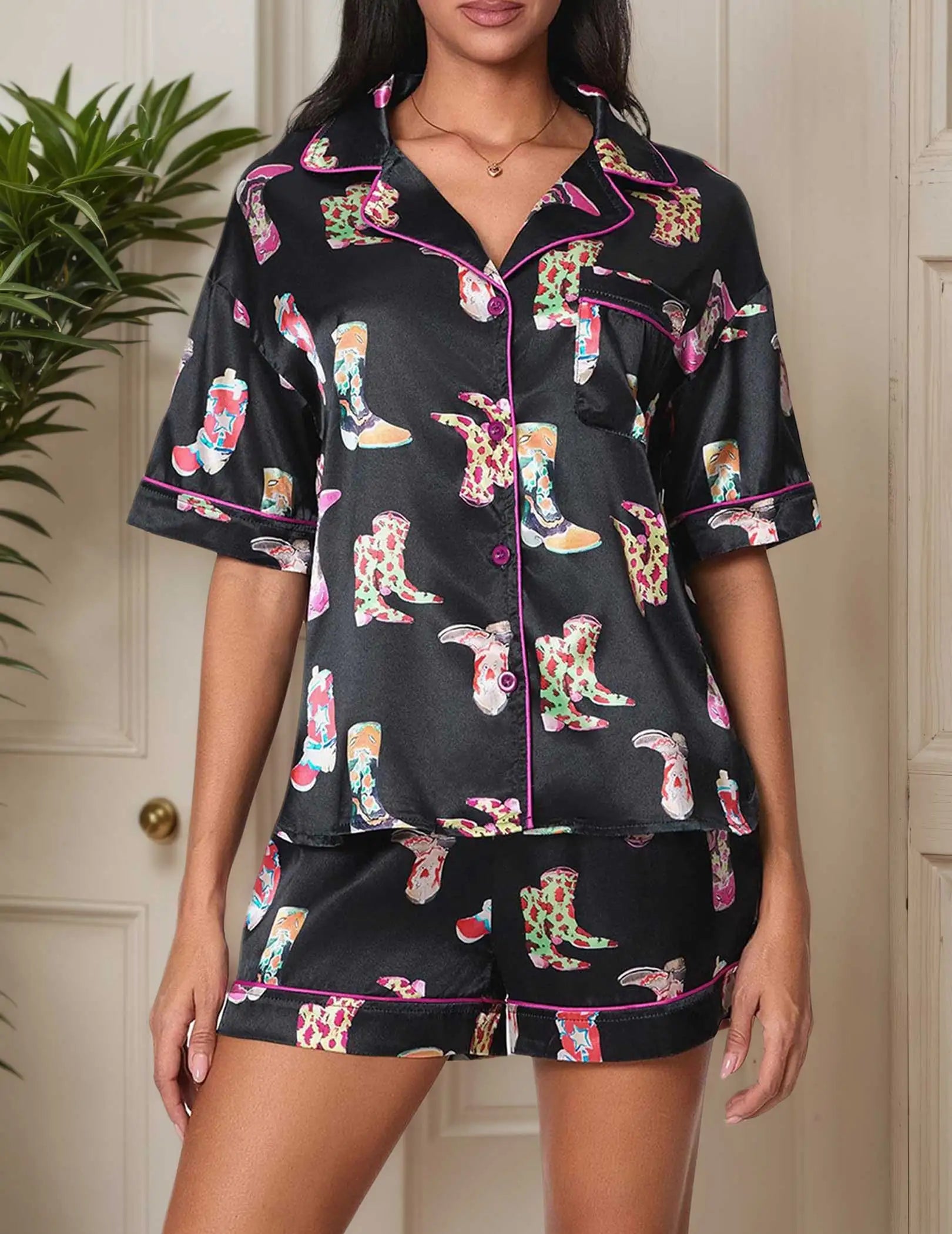 Women 2 Piece Boots Graphic Pajama Set Pocket Patched Button Down Shirt with Shorts Satin Sleepwear