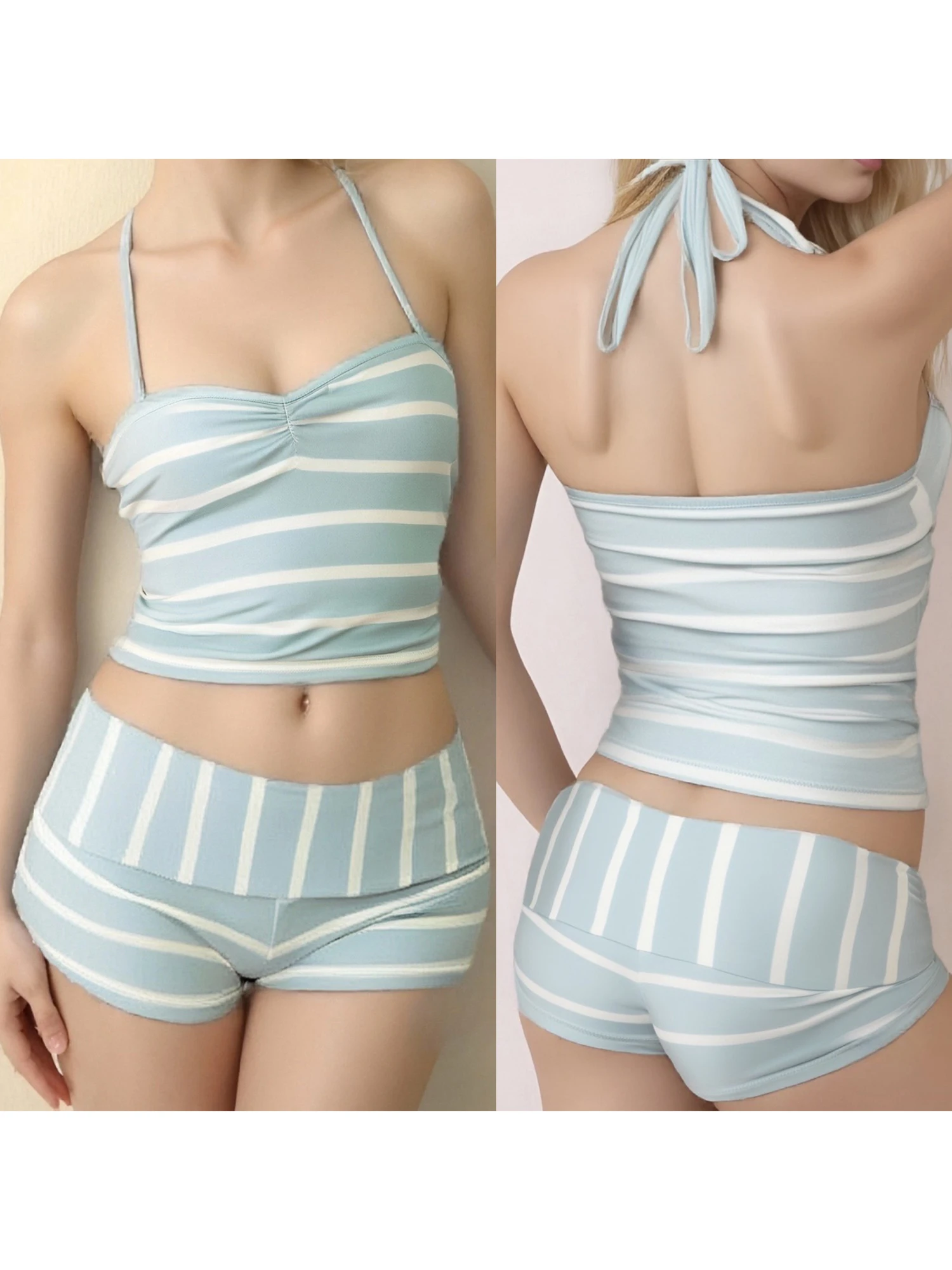 Striped print adds a touch of style; Pajama top, halter neck and backless, sleeveless, crop length; Women's shorts with folded waist; Soft pajama set allows you to relax