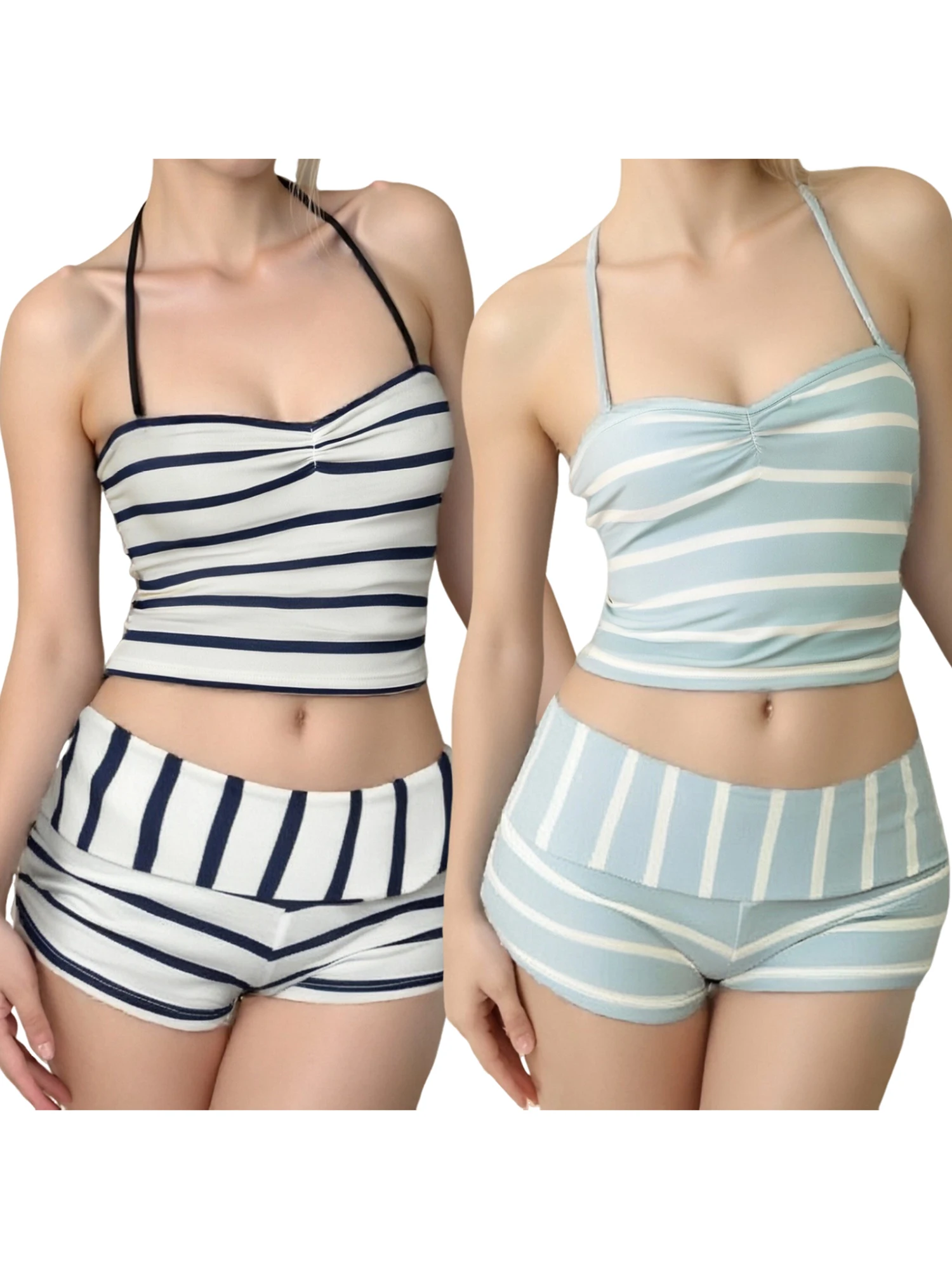 Women 2 Piece Pajamas Set Striped Print Crop Halter Neck Tops and Folded Waist Shorts for Loungewear Soft Sleepwear