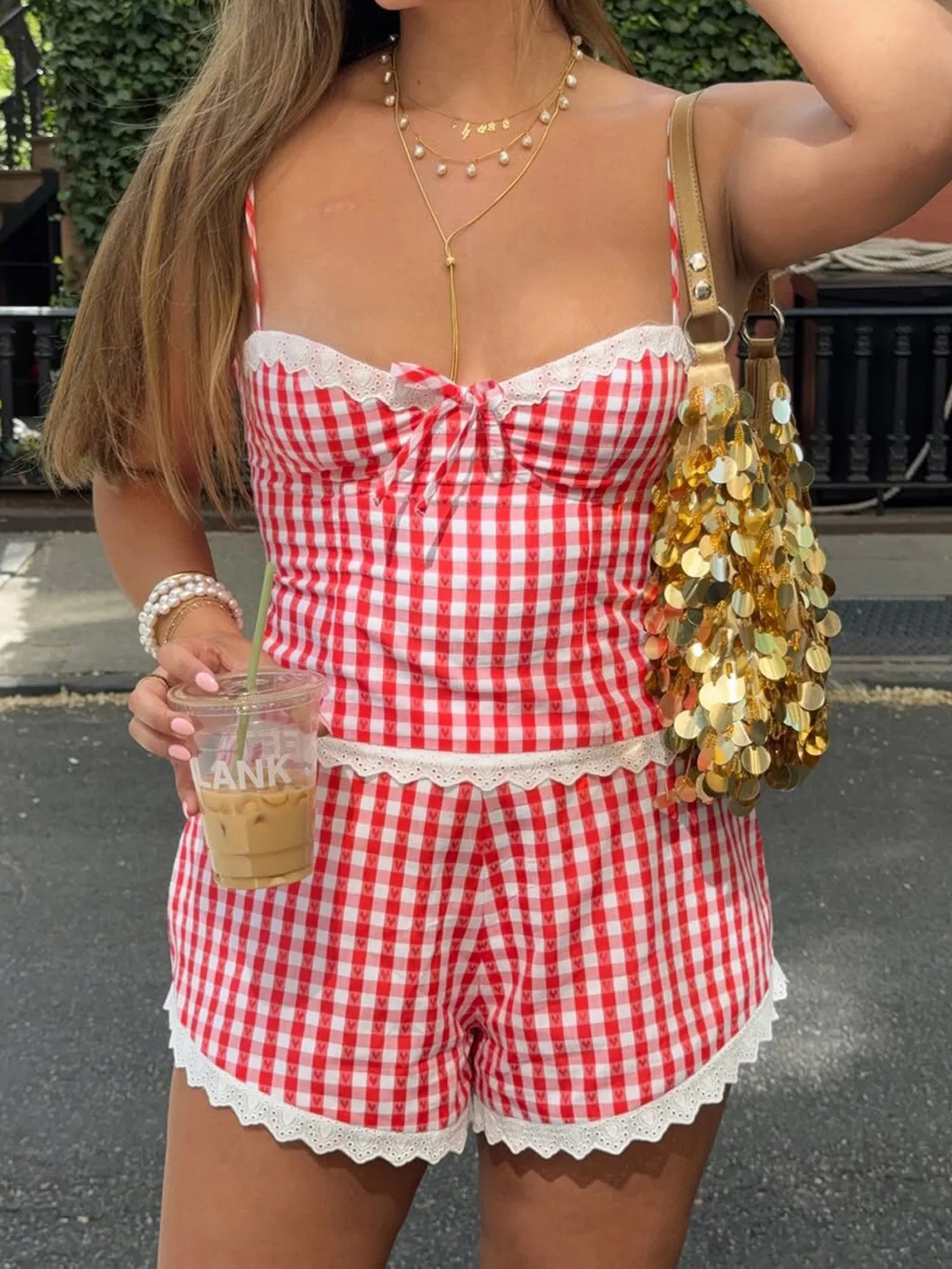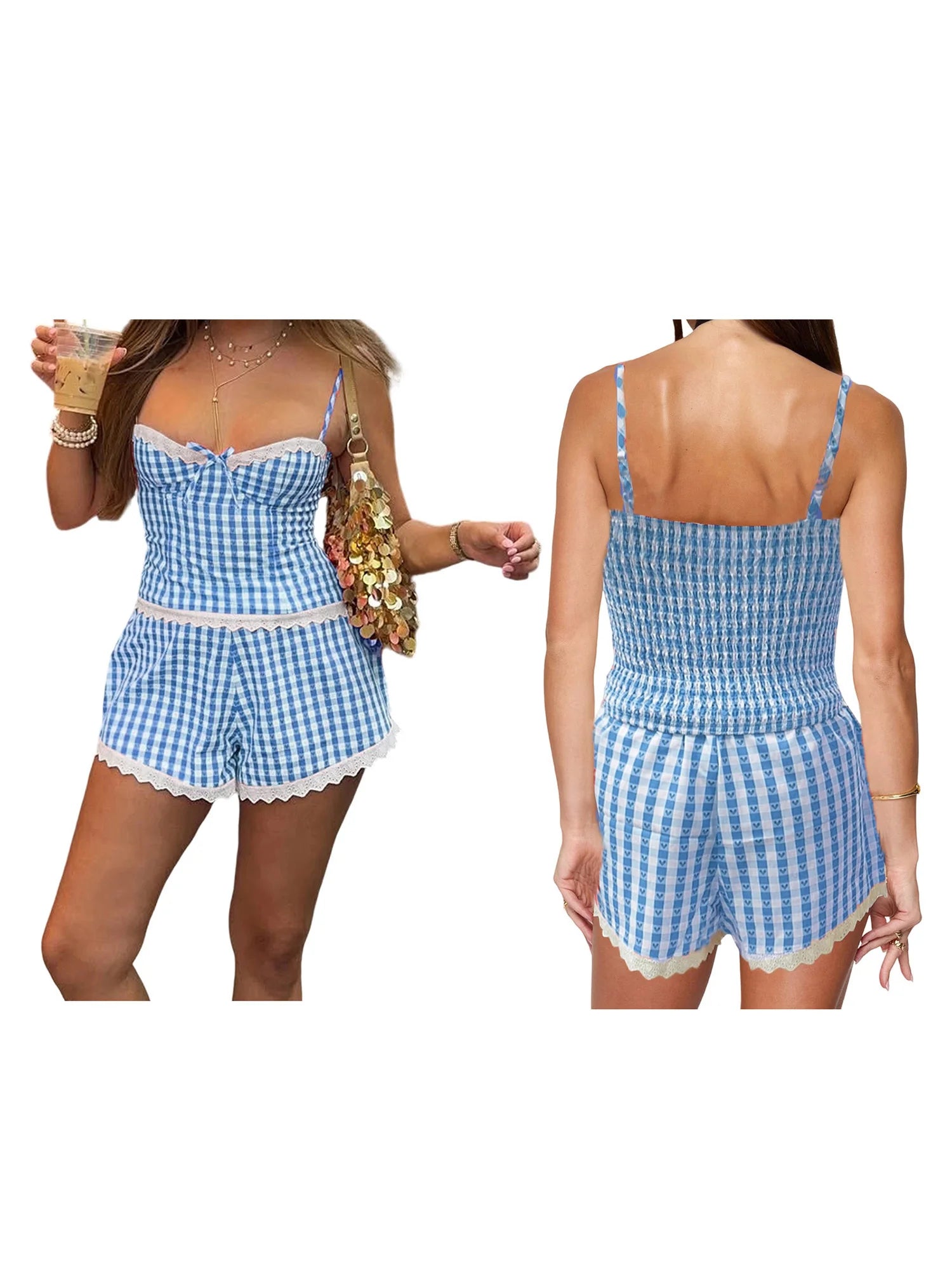 Women 2 Piece Pajamas Set Plaid Prints Lace Trims Camisole and Elastic Shorts for Loungewear Soft Sleepwear