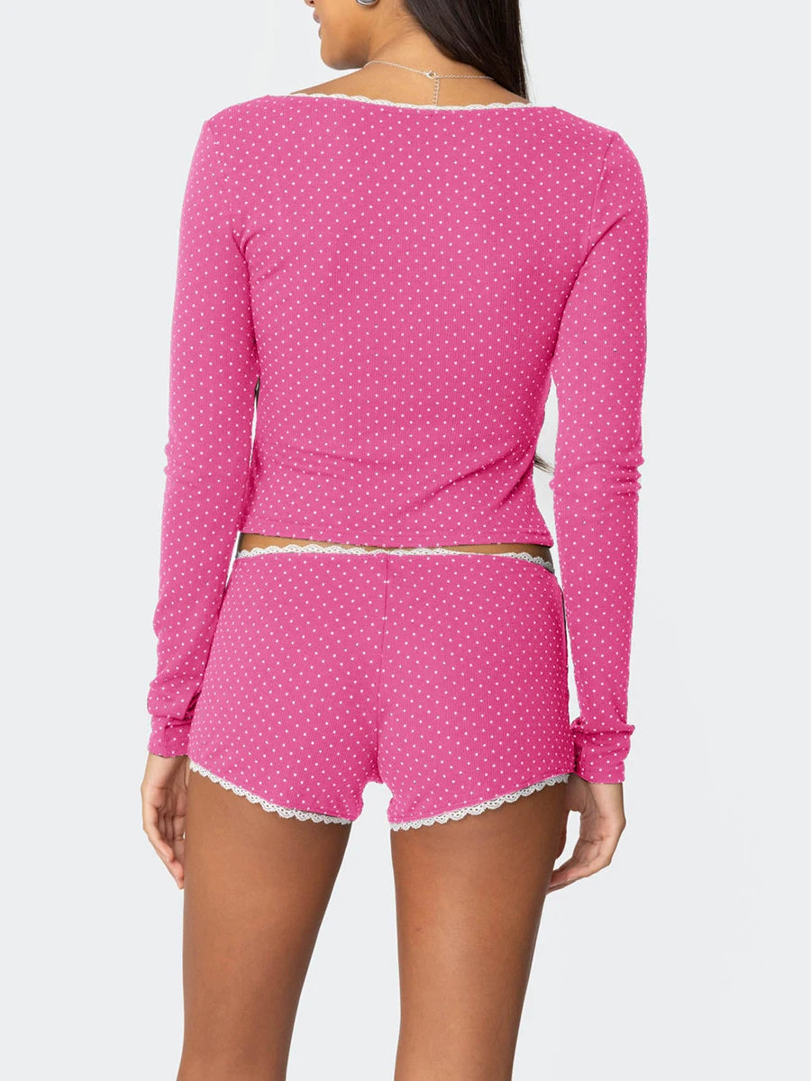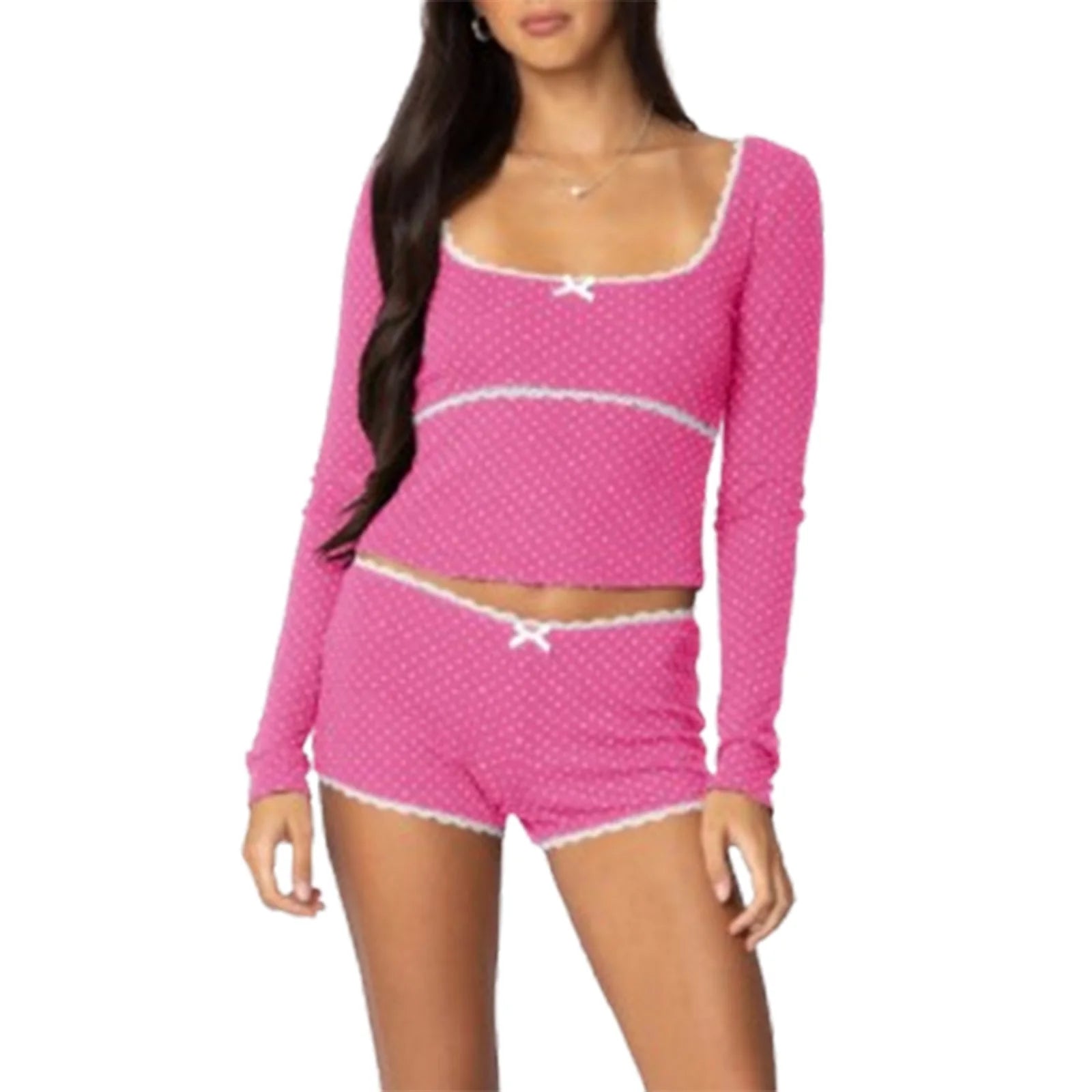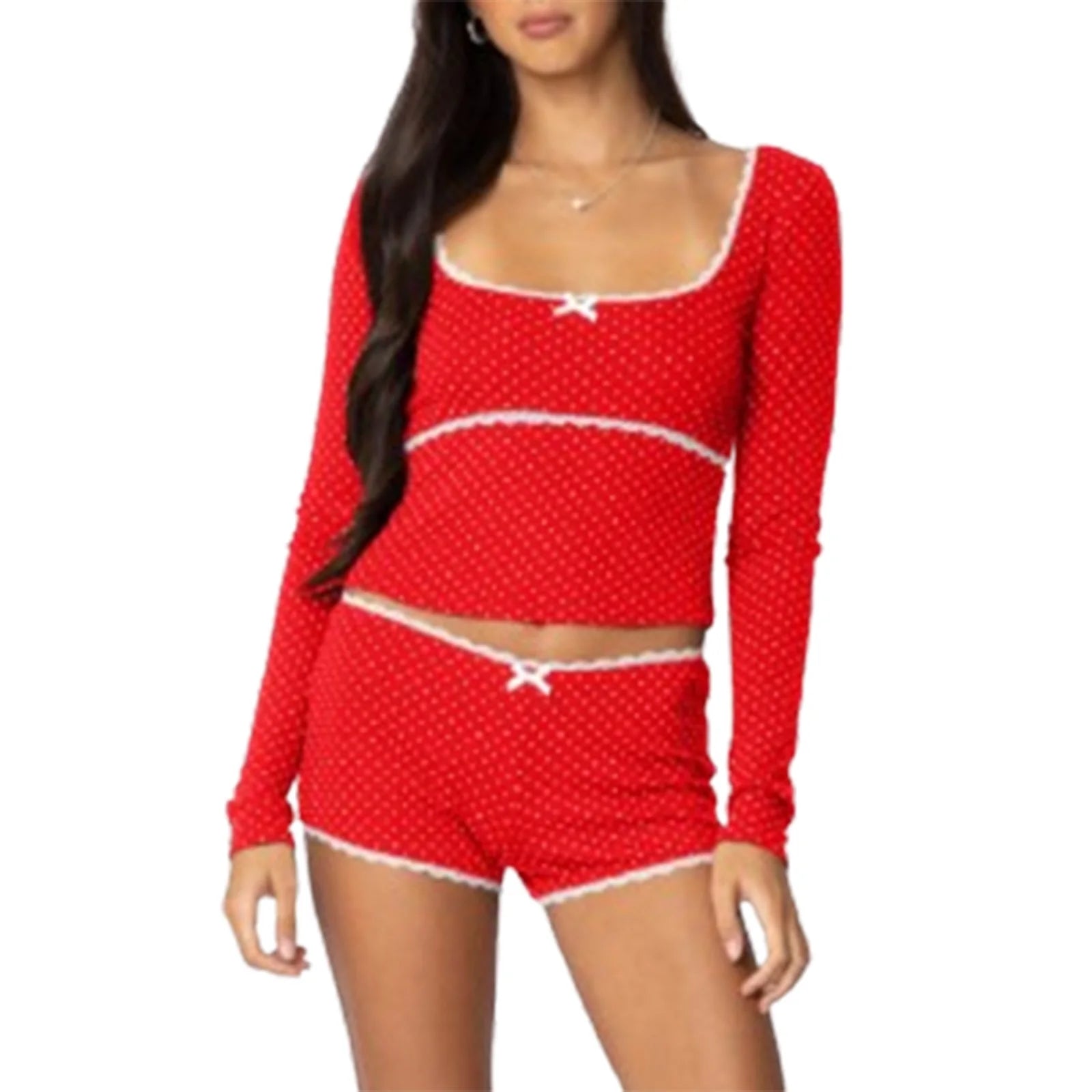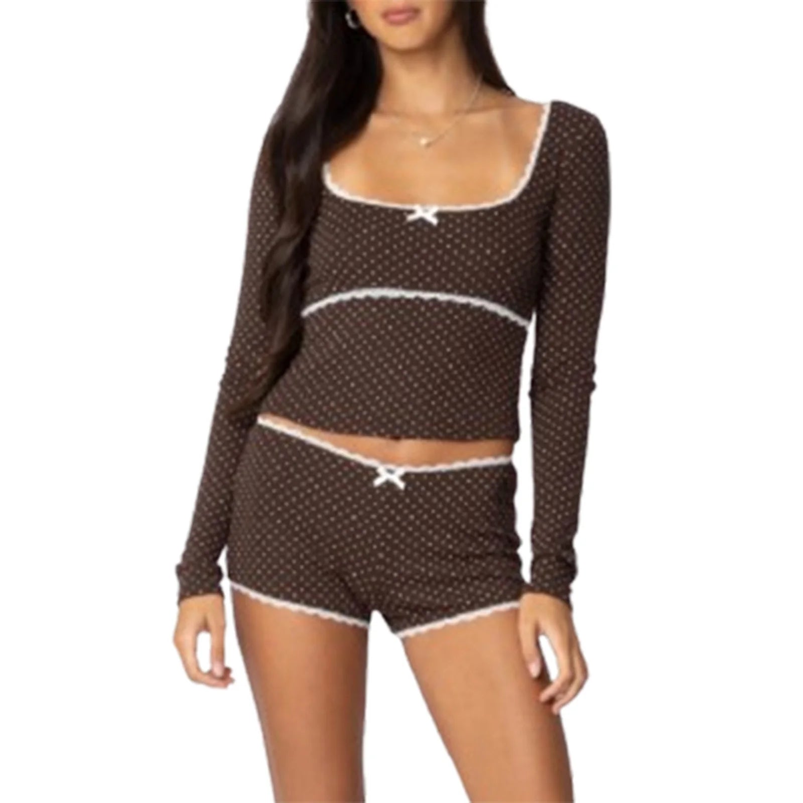 Women's 2PCS Lounge Set Long Sleeve Square Neck Dot Print Tops Shorts Sleepwear Sets