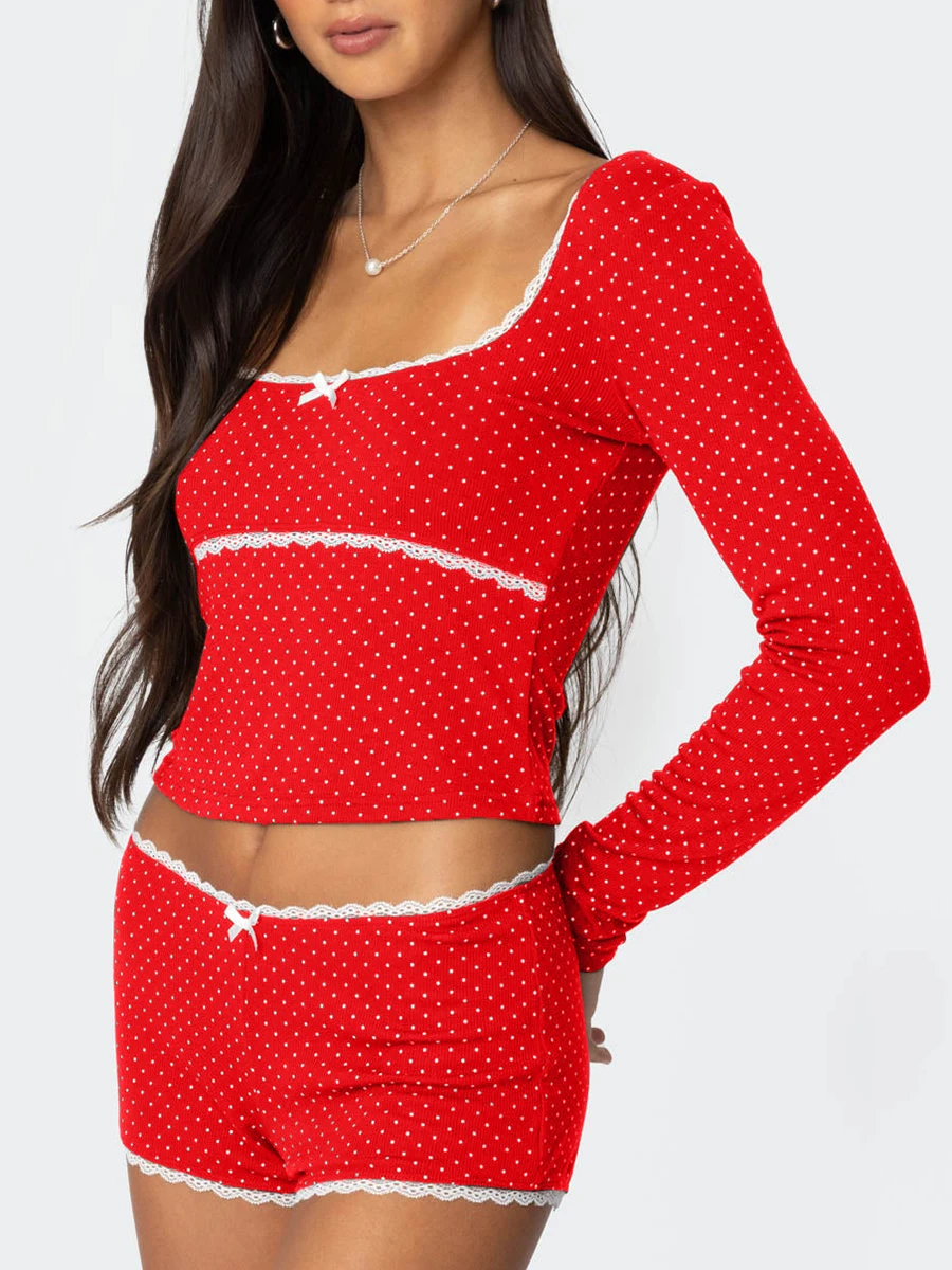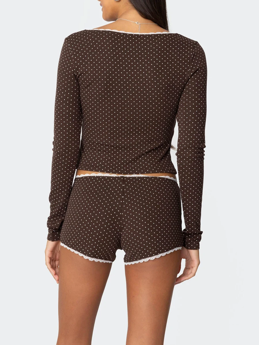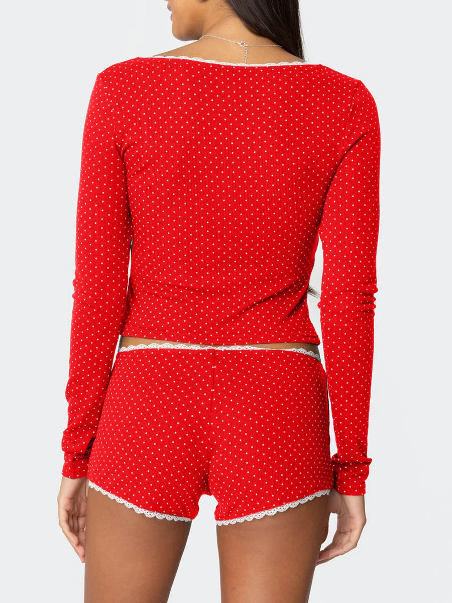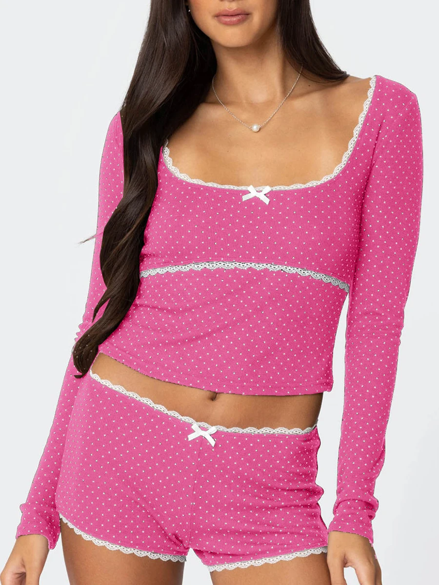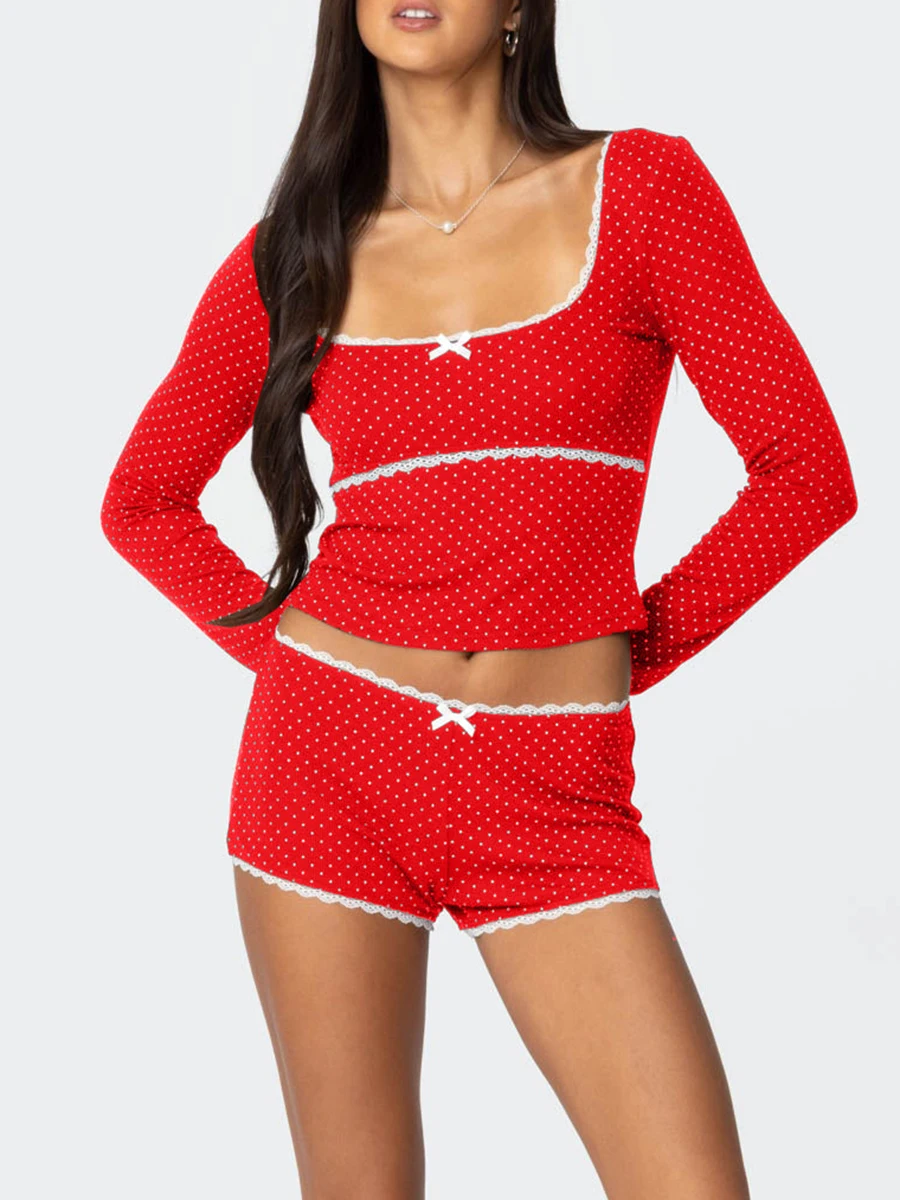 Women's 2PCS Lounge Set Long Sleeve Square Neck Dot Print Tops Shorts Sleepwear Sets