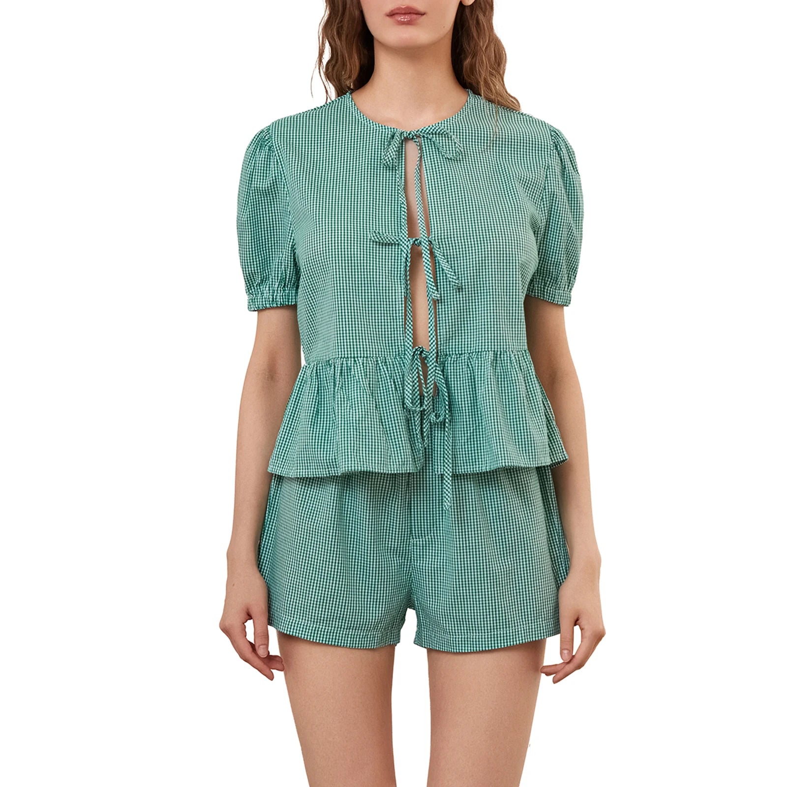 Womens Casual 2 Piece Outfits Puff Sleeve Tie Knot Front Tops + Shorts Set Loungewear
